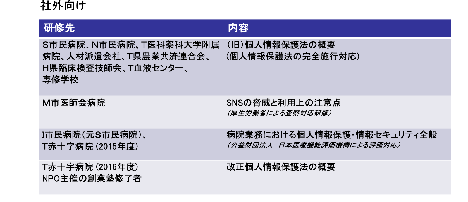 情報セキュリティ・個人情報保護に関する研修講師において、コンテンツだけでなく説明用シナリオも事前に研修実施元に提示して複数回のチェックを受け、受講して良かったと言われるような研修にすることを心がけています。