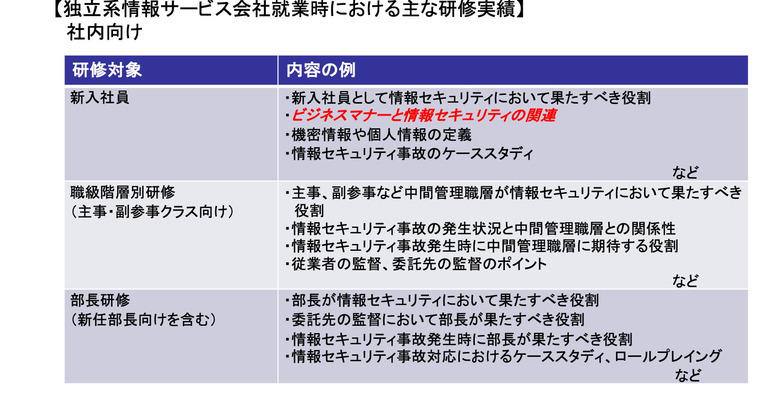 独立系情報サービス会社に勤務していた際、情報セキュリティ・個人情報保護に関する研修について、公的機関を中心に豊富な経験を持っています。
